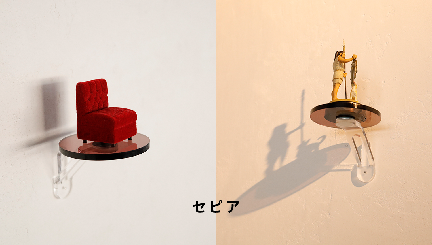 試作を繰り返し、全く新しい構造の棚受けを開発しました。これにより、強度を保ちつつ台座を壁から離すことに成功。これにより、より自由に、置くだけで「特別感」が出せる小さな飾り棚に。